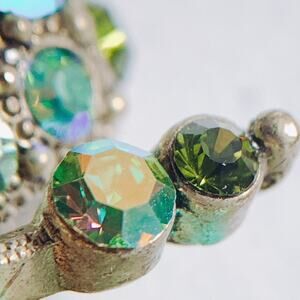 Materials: Gold tone metal; green, olivine-hued, and aurora borealis glass rhinestones
