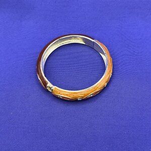 Vintage three-tone hinged bangle bracelet featuring beautiful Autumnal colors in enamel (brown, tan, orange) with lovely crystal accents throughout. All crystals intact. Bracelet measures approx. 2 7/8” in diameter. Some small “dings” visible on silver-tone edge of bracelet. Otherwise, in very good pre-owned condition.