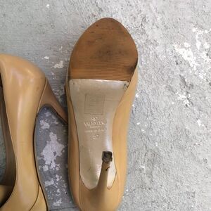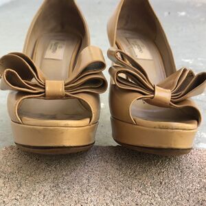 With Peep toe, Please look at the pictures. These are not perfect. They have light color transfer, which are showing pictures, and the heels have scuffing. They also need new heel caps heel height is 4.5 inches platform height is .5