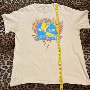 Van Halen Band Musician Tan 1979 Tour Fire Flame Graphic Shirt. Size medium, please note; has signs of wear.