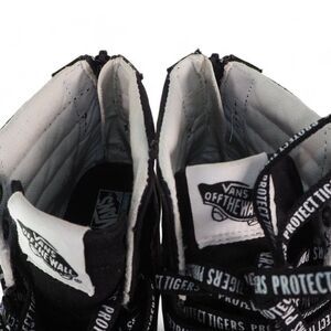Step up your sneaker game with the Vans x Discovery ComfyCush Sk8-Hi "Project Cat." These striking black and white high-top sneakers feature a bold tiger print that adds a fierce touch to any outfit. Designed for comfort and style, the ComfyCush technology ensures a cushioned fit, making them perfect for all-day wear. Embrace your wild side and make a statement with every step in these unique sneakers that blend fashion and functionality seamlessly.
