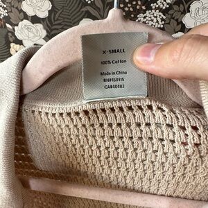 Brown knit (100% Cotton). Top. Collared neckline. Short sleeves. Pull-on. 29.5" from shoulder to hemline.