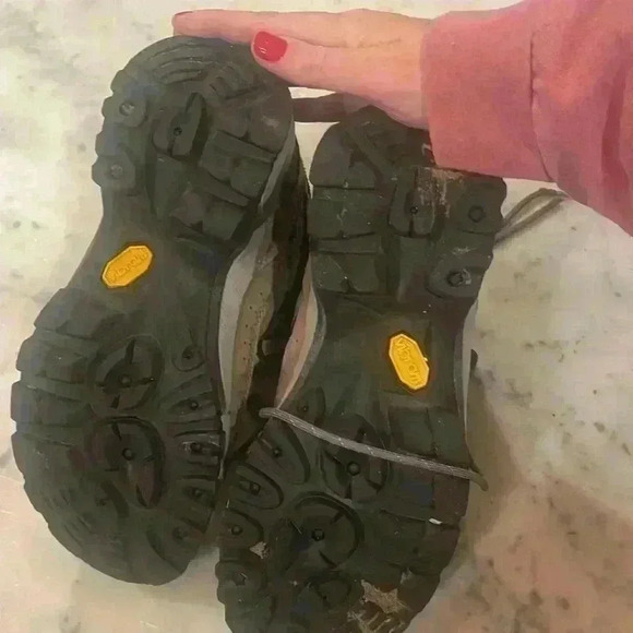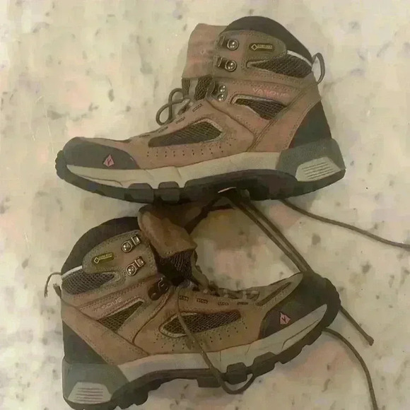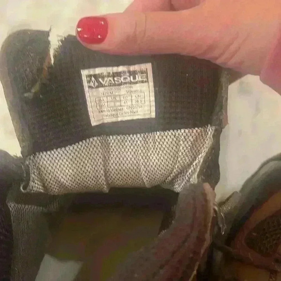 Vasque women’s hiking boots size 9 1/2. Overall good condition but a little bit of damage, including a rip on the tongue and one of the loops in the back. May need new laces.