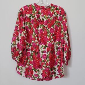 Vibrant floral silk blouse with button-up front. Features a mix of pink and green hues. Perfect for a fresh, stylish look. Artsy smock style with shirttail hem