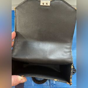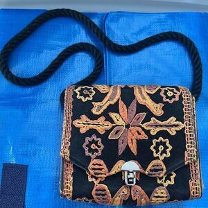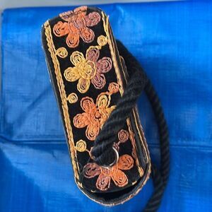 Beautiful black velvet toggle closer. Orange yellow and brown embroidery. Black twisted rope style shoulder strap. Good condition, approximately