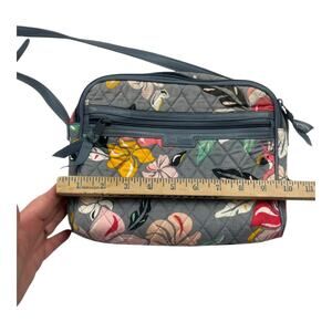 Gray floral quilted crossbody bag – approx. 10" x 8" x 3", adjustable strap, front zip pocket, floral pattern with pink, yellow & green accents.