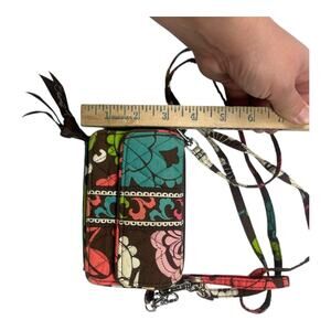 Brown floral wristlet wallet (retired pattern) – approx. 6.5" x 4" x 2", removable strap, multiple card slots, bright pink interior, excellent for travel or errands.