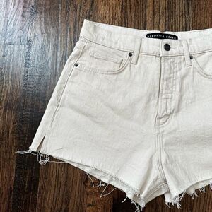 Features a high rise, classic five-pocket styling and a raw cut-off hem. Model is 5'10" wearing size 26. Rise 12" Inseam 2 1/2" Leg opening 25 1/2". Machine wash on cold.