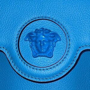 100% authentic Versace La Medusa Mini Crossbody Bag in bold blue pebbled leather. Brand new with tags and dustbag. Features the signature Medusa logo embossed on the front in a matching tone.