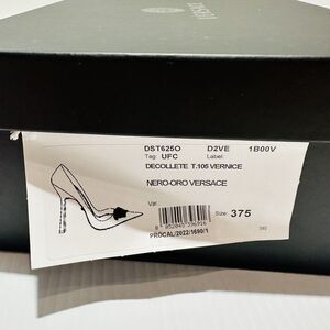 Versace Medusa 37.5/ US 7.5 Gold Black Patent Leather Pointed Toe Pump NIB $995