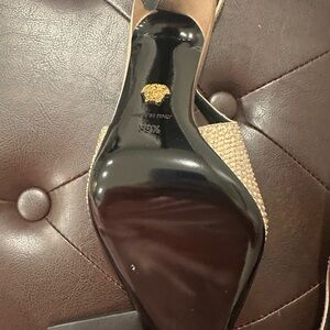 Chic Versace heels with dazzling gold accents. Ideal for a stylish look.