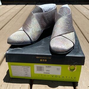 Very Volatile glossy silver floral cloth strap ankle booties size 6.5