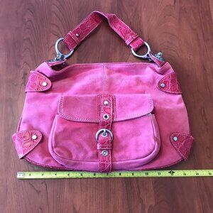 Beautiful pink suede shoulder bag. Animal print embossed leather shoulder strap and buckle closures. Silver hardware. Magnetic snap closure. Interior tan fabric lining.