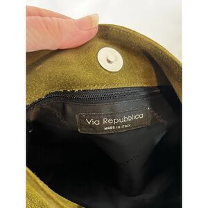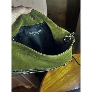 Unique silver detailing on the handle and a zipper across the purse. A couple spots are scratched or indented from storage (see photos). No scratching on croco areas. Clean interior with one zipper pouch. Approximately 12x8.5x4 inches.