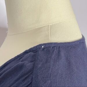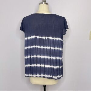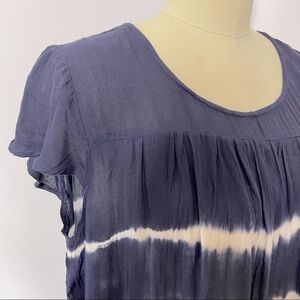 The perfect summer top! So lightweight! Tie dye is so on trend right now! Dark blue/navy background with strips of white in between. Short flutter sleeves. Rolled finishings on hem, sleeves, and collar. Higher neckline. Pleated fabric. Fabric is a little see through. Falls loosely on the body. There is a tiny loop of white thread on the shoulder- this is from the inner white hanger loops in the top. Can be seam ripped out. Such a fun boho nautical top!