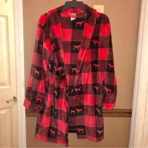 Victoria’s Secret Pink Plaid Dog Print Plush Fuzzy Robe Red Black XS/S