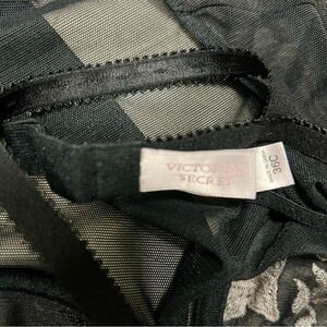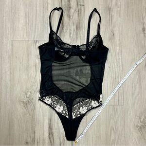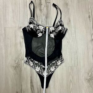 New without tags vintage 90’s Victoria’s Secret teddy in stretchy black mesh, snap thong crotch, and cream floral embroidery accents. Unlined. Adjustable straps as shown. Unlined underwire cups size 36 C. Has been in storage since purchasing. Super sexy and feminine! Measurements in photos.
