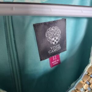 Vince Camuto Blue Printed Watercolor Chiffon Halter Top Gold Beads Maxi Dress womens size 12