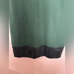 Rich dark green sheath dress features a wide strip of sparkling green sequins across bottom hem. Fully lined with invisible back zipper and keyhole button closure.