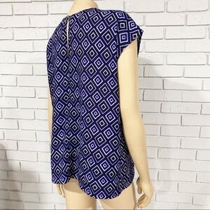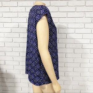 A gently used geometric top, with a bit of fun beaded detail at the top. 97% polyester and 3% spandex. Length 26.” Armpit to armpit measurement lying flat 21.”