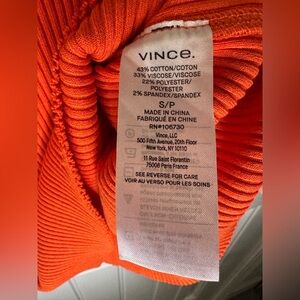 This fitted tank top by Vince features a vibrant orange hue and a ribbed texture, offering a stylish and comfortable fit. The sleeveless design and scoop neckline make it an ideal choice for warm weather. Its stretchy knit material ensures a flattering silhouette, perfect for casual outings or layering.