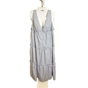 Vine & Love Blue White Striped Maxi Dress Deep V Neck Tiered Skirt Women’s Sz M