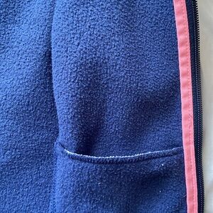 Women's size small. Color is navy with pink piping inside. Full front zipper at chest, two front zippered pockets and two inside pockets that are not zipped.