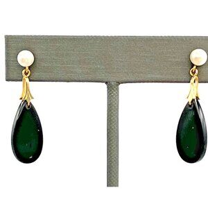 Vintage 14k Yellow Gold Pearl & Black Onyx Dangle Drop Pierced Earrings 1 3/8"