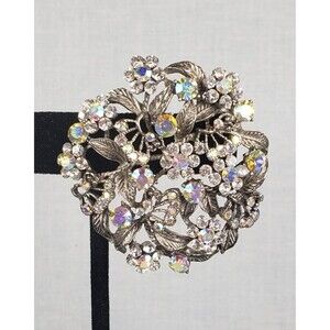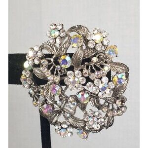 Vintage 1950's Flower Filigree AB Crystal Rhinestone Silver Tone 2" Brooch