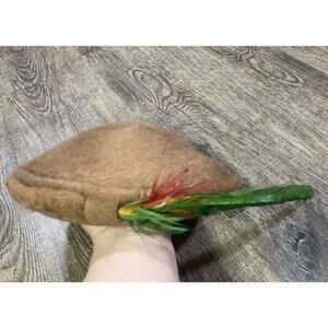 Vintage 1950’s Ladies Imported Alaskan Fur Pillbox Fascinator Hat Miss Howes Inc. Lowell. The hat has an exposed stitching cluster near the front from when it was made. The green large feather has some light color loss and chipping in a few tiny spots on the underside facing the hat. It was stored in a box with a few other hats for a good number of years so it has a slight scent of storage to it. I’m not sure what type of fur this is made of as it isn’t disclosed on the tag. The hat rim opening measures 6.75” across and the rim thickness is 1”. Please message me prior to purchase with any questions. Thank you!