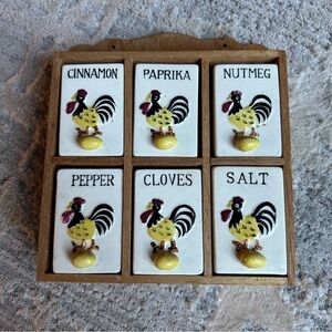 Vintage 1950s Wall Mount Spice Rack Set Wood Frame Retro Rooster Spice Jars