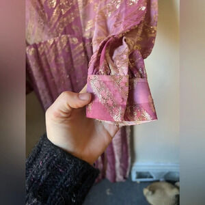 Incredible dress with light wear. Pleated skirt with metallic floral threading, v neck neckline, loose puffy sleeves.