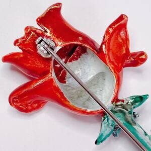 A bright enamel rose from the 70s or 80s, where bold color met simple form. Its clean lines, silver tone reverse, and rich red petals create a timeless accent that adds vintage character without pretense.