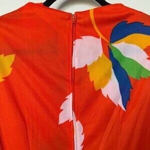 Vintage dress in orange with a floral print, a boat neck and long sleeves.