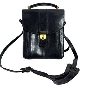 This vintage 80s black leather bag features a top handle and accordion shoulder design. It includes a front flap with a clasp, offering both style and functionality.