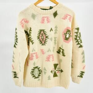 Vintage 80s Outback Red Cream Wool Heavy Knit Geometric Pastel Sweater