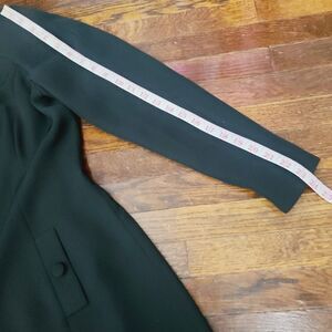 DETAILS: super pretty and structured black long sleeve dress with power shoulder pads and metallic gold neck trim. back zipper & hook and eye closure x4. made in Hong Kong Dry clean