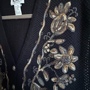 Vintage 90s Koret Petites Dark Navy Blue Button-up Sleeveless Knit Sweater Vest with Silver and Gold Metallic Floral Embroidery