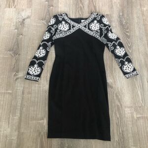 Vintage Womens Adrienne Vittadini Petite Black Sheath White Beaded Elegant Dress. Womens Petite Size 2. No rips, tears or stains. No missing beads. Wool and Acrylic Blend. Pit-to-pit 16", Waist 14", Collar-to-Hem 34.5".