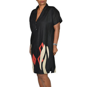 Vintage Andrea Jovine Linen Dress Black Print Abstract Embroidery Cocoon Medium