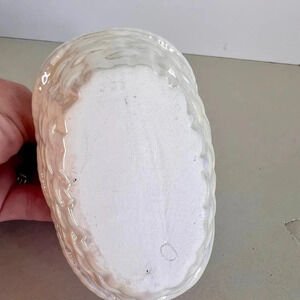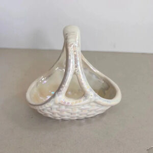 Vintage Pre-owned ceramic basket, exhibiting a woven pattern and iridescent off-white glaze. It features a handle and measures approximately 3 1/2 inches in length. No brand or model is visible signed A or D. The item is functional as a small decorative container.