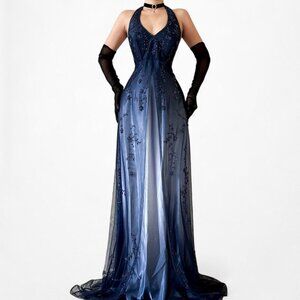 Y2K 2000s coquette fairy blue babydoll style maxi dress. Halter V-Neck. Floral beaded throughout on a mesh overlay with satin gradient fabric lining. Back zip closure