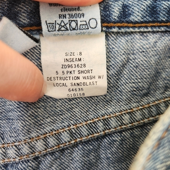 Classic 5 pocket design jean shorts with 10.5 inch rise and 5 inch inseam. 100% cotton. In great pre-owned condition. Measures approximately 15.5 inches across at waist.
