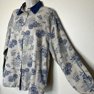 Vintage Capacity Linen Floral Denim Tan Long Sleeve Button Front Shirt Women XL