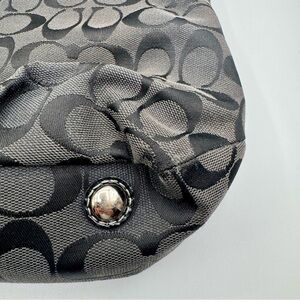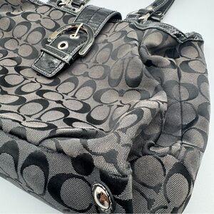 Chic black shoulder bag with iconic Coach pattern. Stylish buckle detail. Ideal for everyday use.