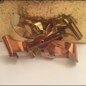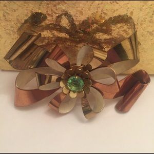 Copper color Brooch, with center green stone, bow style design, I believe this brooch is from the 1940s. Pin back functions well.