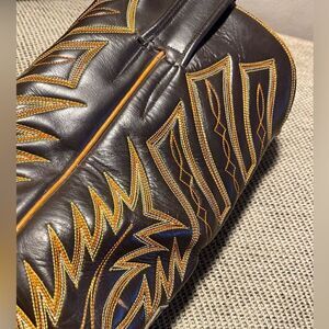The color of these boots is amazing. It’s the richest cognac with a deep, dark chocolate and stitching for accent is multicolored, in flame eagle design.