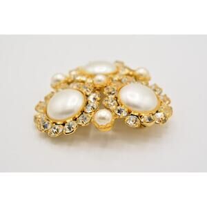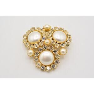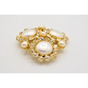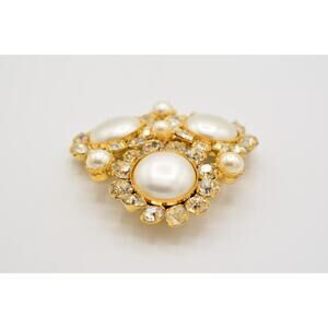 Vintage Crystal Pin Brooch Pearl Prong Cluster Gold Rhinestone Chunky 80s BinAC
