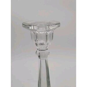 Vintage Heisey Windsor pattern candlesticks, featuring exquisite etched designs that showcase the elegance of the glassmaking technique. The 10-inch tall crystal candlesticks reflect light beautifully. Crafted from high-quality glass, these candlesticks are a testament to Heisey's legacy of producing elegant glassware.