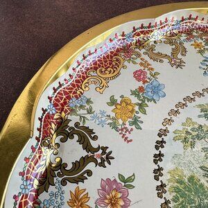 This vintage Daher tin tray features a vibrant floral design with an intricate Asian-inspired scene. Perfect for serving, décor, or collectors.